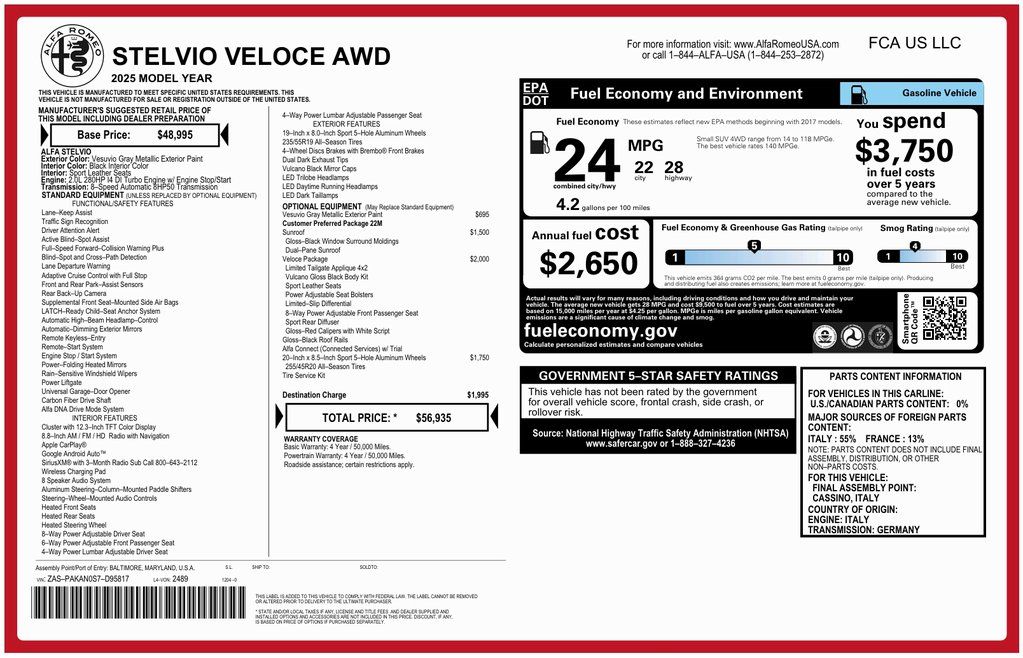Boston Motorsports is proud to present this 2025 Alfa Romeo Stelvio Veloce I4 DI Turbo Engine 8-Speed Automatic Transmission AWD optioned in Vesuvio Gray Metallic over Black. Well maintained Stelvio boasting a clean 1-owner Carfax. Fully serviced and professionally detailed, now available in our Boston showroom!